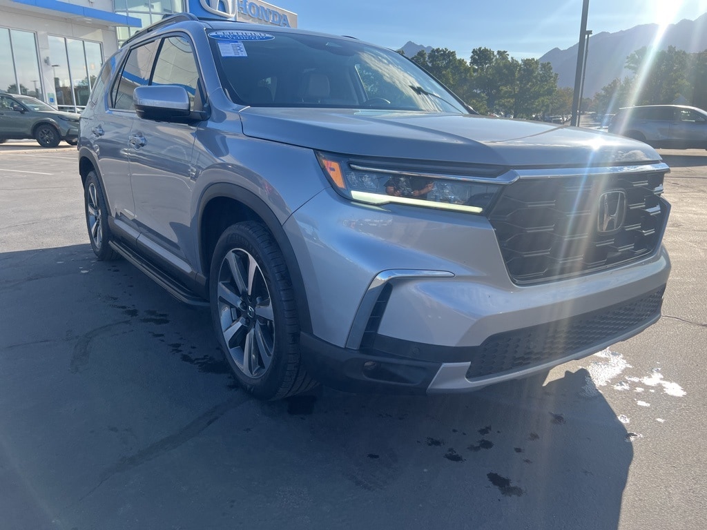 Pilot Elite, HondaTrue Certified Certified, 4D Sport Utility, 3.5L V6 DOHC 24V, 10-Speed Automatic, AWD, Silver, Gray Leather, 12 Speakers, 3rd row seats: split-bench, 4-Wheel Disc Brakes, ABS brakes, Adaptive Cruise Control: Adaptive Cruise Control (ACC) with Low-Speed Follow, Air Conditioning, Alloy wheels, AM/FM radio: SiriusXM, Apple CarPlay/Android Auto, Auto High-beam Headlights, Auto-dimming door mirrors, Auto-dimming Rear-View mirror, Automatic temperature control, Axle Ratio: 4.167, Blind Spot Information (BSI) System warning, Bose Premium Sound System, Brake assist, Bumpers: body-color, Compass, Delay-off headlights, Driver door bin, Driver vanity mirror, Dual front impact airbags, Dual front side impact airbags, Electronic Stability Control, Emergency communication system: HondaLink, Four wheel independent suspension, Front anti-roll bar, Front Bucket Seats, Front Center Armrest, Front dual zone A/C, Front fog lights, Front reading lights, Fully automatic headlights, Garage door transmitter: HomeLink, Heads-Up Display, Heated & Ventilated Front Bucket Seats, Heated door mirrors, Heated front seats, Heated rear seats, Heated steering wheel, Illuminated entry, Knee airbag, Lane departure: Lane Keeping Assist System (LKAS) active, Low tire pressure warning, Memory seat, Navigation system: Honda Satellite-Linked Navigation System, Occupant sensing airbag, Outside temperature display, Overhead airbag, Overhead console, Panic alarm, Passenger door bin, Passenger vanity mirror, Perforated Leather Seat Trim, Power door mirrors, Power driver seat, Power Liftgate, Power moonroof, Power passenger seat, Power steering, Power windows, Radio data system, Rain sensing wipers, Rear air conditioning, Rear anti-roll bar, Rear reading lights, Rear seat center armrest, Rear window defroster, Rear window wiper, Reclining 3rd row seat, Remote keyless entry, Security system, Speed control, Speed-sensing steering, Speed-Sensitive Wipers, Split folding rear seat, Spoiler, Steering wheel mounted audio controls, Tachometer, Telescoping steering wheel, Tilt steering wheel, Traction control, Trip computer, Turn signal indicator mirrors, Variably intermittent wipers, Ventilated front seats, Wheels: 20" Machine Face Shark Gray w/Blk Lug Nuts, Pilot Elite, 4D Sport Utility, 3.5L V6 DOHC 24V, 10-Speed Automatic, AWD, Silver, Gray Leather.