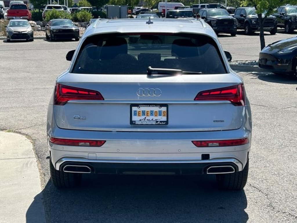 Silver 2022 Audi Q5 45 S line Premium Plus quattro quattro 7-Speed Automatic S tronic 2.0L Turbocharged Black Leather, ABS brakes, Alloy wheels, Compass, Electronic Stability Control, Front dual zone A/C, Heated door mirrors, Heated front seats, Illuminated entry, Low tire pressure warning, Power Liftgate, Remote keyless entry, Traction control.