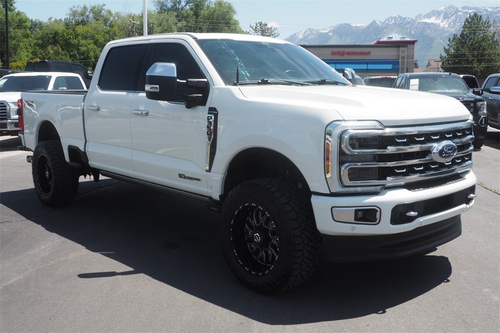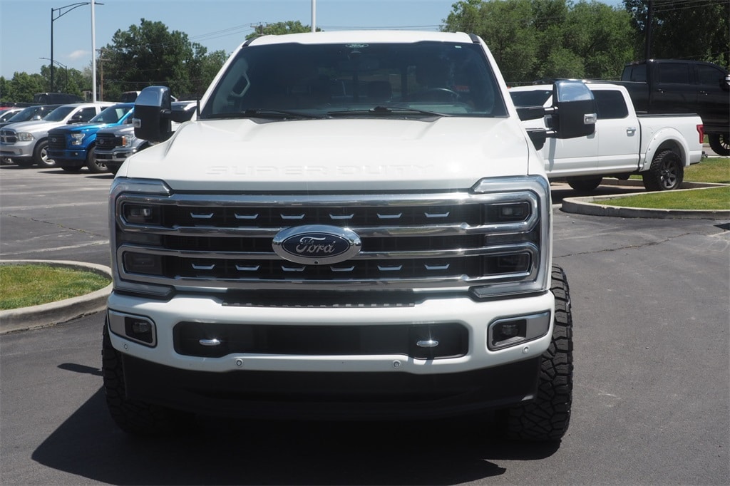 White Metallic 2024 Ford F-350SD Platinum 4WD 10-Speed Automatic Power Stroke 6.7L V8 DI 32V OHV Turbodiesel LIFTED, CLEAN CARFAX, OVERSIZED 37" TIRES, 4WD, 5th Wheel/Gooseneck Hitch Prep Package, FX4 Off-Road Package, Hill Descent Control, Navigation system: Connected Navigation (includes complimentary 1-year trial), Off-Road Specifically Tuned Shock Absorbers, Unique FX4 Off-Road Box Decal.