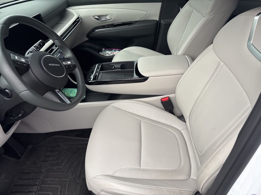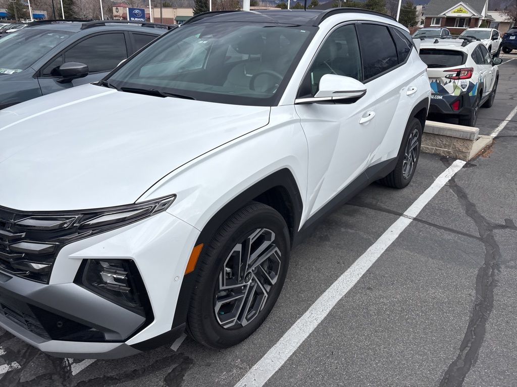 This 2025 Creamy White Pearl Hyundai Tucson Hybrid Limited AWD is well equipped and includes these features and benefits: Option Group 01, 1.6L I4 DGI Hybrid Turbocharged DOHC 16V LEV3-SULEV30, 19" Alloy Wheels, 4-Wheel Disc Brakes, 8 Speakers, ABS brakes, Air Conditioning, Alloy wheels, AM/FM radio: SiriusXM, Apple CarPlay & Android Auto, Auto High-beam Headlights, Auto-dimming Rear-View mirror, Automatic temperature control, Brake assist, Bumpers: body-color, Cargo Net, Cargo Tray, Carpeted Floor Mats, Cross Rails, Delay-off headlights, Driver door bin, Driver vanity mirror, Dual front impact airbags, Dual front side impact airbags, Electronic Stability Control, Emergency communication system: Bluelink+, Four wheel independent suspension, Front anti-roll bar, Front Bucket Seats, Front Center Armrest, Front dual zone A/C, Front reading lights, Fully automatic headlights, Garage door transmitter: HomeLink, Heads-Up Display, Heated & Ventilated Front Bucket Seats, Heated door mirrors, Heated front seats, Heated rear seats, Heated steering wheel, Illuminated entry, Leather steering wheel, Leather-Trimmed Seat Trim, Low tire pressure warning, Memory seat, Navigation System, Occupant sensing airbag, Outside temperature display, Overhead airbag, Overhead console, Panic alarm, Passenger door bin, Passenger vanity mirror, Power door mirrors, Power driver seat, Power Liftgate, Power moonroof, Power passenger seat, Power steering, Power windows, Radio data system, Radio: Bose Premium w/AM/FM/HD Audio System, Rain sensing wipers, Rear anti-roll bar, Rear reading lights, Rear seat center armrest, Rear side impact airbag, Rear window defroster, Rear window wiper, Remote keyless entry, Security system, Speed control, Split folding rear seat, Spoiler, Steering wheel mounted audio controls, Tachometer, Telescoping steering wheel, Tilt steering wheel, Traction control, Trip computer, Turn signal indicator mirrors, Variably intermittent wipers, and Ventilated front seats.