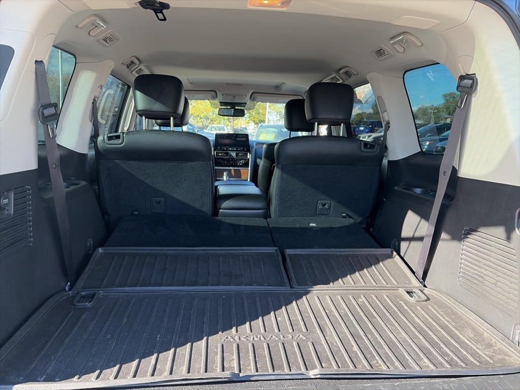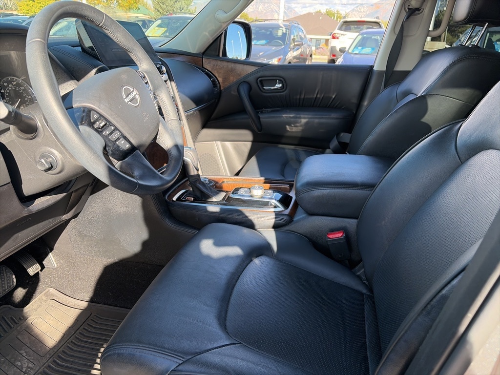 This 2023 Gun Metallic Nissan Armada SL 4WD is well equipped and includes these features and benefits: Captain's Chairs Package (2nd Row Captain's Chairs and 2nd Row Center Console w/Padded Armrest), Cargo Package, 4WD, 13 Speakers, 2.94 Axle Ratio, 3rd Row Carpeted Floor Mats - Captain Seat, 3rd row seats: split-bench, 4-Wheel Disc Brakes, ABS brakes, Air Conditioning, Alloy wheels, AM/FM radio: SiriusXM, Anti-whiplash front head restraints, Auto High-beam Headlights, Auto tilt-away steering wheel, Auto-dimming door mirrors, Auto-dimming Rear-View mirror, Auto-leveling suspension, Automatic temperature control, Bose 13-Speaker Premium Audio System, Brake assist, Bumpers: body-color, Cross Bars, Delay-off headlights, Driver door bin, Driver vanity mirror, Dual front impact airbags, Dual front side impact airbags, Electronic Stability Control, Emergency communication system: NissanConnect Services, Exterior Parking Camera Rear, Four wheel independent suspension, Front anti-roll bar, Front Bucket Seats, Front Center Armrest, Front dual zone A/C, Front fog lights, Front reading lights, Fully automatic headlights, Garage door transmitter: HomeLink, Heated door mirrors, Heated Front Bucket Seats, Heated front seats, Heated steering wheel, Illuminated entry, Illuminated Kick Plates, Knee airbag, Leather Shift Knob, Leather-Appointed Seat Trim, Low tire pressure warning, Memory seat, Navigation System, NissanConnect featuring Apple CarPlay and Android Auto, Occupant sensing airbag, Outside temperature display, Overhead airbag, Overhead console, Panic alarm, Passenger door bin, Passenger vanity mirror, Power door mirrors, Power driver seat, Power Liftgate, Power moonroof, Power passenger seat, Power steering, Power windows, Premium audio system: Bose, Radio: NissanConnect w/SiriusXM, Rear air conditioning, Rear anti-roll bar, Rear reading lights, Rear seat center armrest, Rear window defroster, Rear window wiper, Reclining 3rd row seat, Remote keyless entry, Security system, Speed control, Speed-sensing steering, Speed-Sensitive Wipers, Split folding rear seat, Spoiler, Steering wheel memory, Steering wheel mounted audio controls, Tachometer, Telescoping steering wheel, Tilt steering wheel, Traction control, Trip computer, Turn signal indicator mirrors, Variably intermittent wipers, Voltmeter, and Wheels: 20" x 8J Painted Alloy.