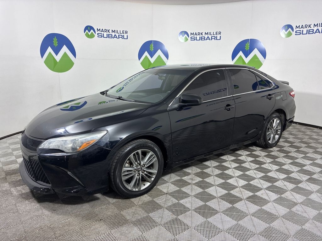 This 2016 Black Toyota Camry SE FWD is well equipped and includes these features and benefits: Black w/Leather Seat Trim, 4-Wheel Disc Brakes, 6 Speakers, 7.0J x 17" Alloy Wheels, ABS brakes, Air Conditioning, Alloy wheels, AM/FM radio, Brake assist, Bumpers: body-color, CD player, Delay-off headlights, Driver door bin, Driver vanity mirror, Dual front impact airbags, Dual front side impact airbags, Electronic Stability Control, Exterior Parking Camera Rear, Fabric Seat Trim, Four wheel independent suspension, Front anti-roll bar, Front Bucket Seats, Front Center Armrest, Front reading lights, Fully automatic headlights, Heated door mirrors, Illuminated entry, Knee airbag, Leather steering wheel, Low tire pressure warning, Occupant sensing airbag, Outside temperature display, Overhead airbag, Overhead console, Panic alarm, Passenger door bin, Passenger vanity mirror, Power door mirrors, Power driver seat, Power steering, Power windows, Radio: Entune Audio, Rear anti-roll bar, Rear seat center armrest, Rear side impact airbag, Rear window defroster, Remote keyless entry, Speed control, Speed-sensing steering, Split folding rear seat, Spoiler, Sport steering wheel, Steering wheel mounted audio controls, Tachometer, Telescoping steering wheel, Tilt steering wheel, Traction control, Trip computer, and Variably intermittent wipers.