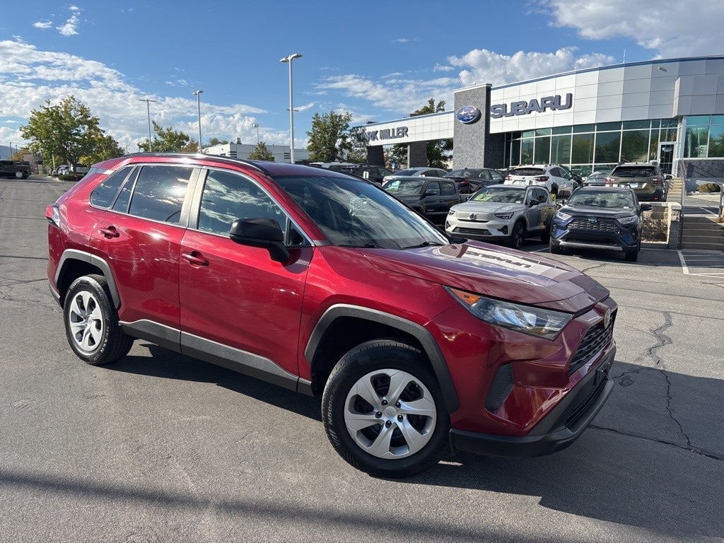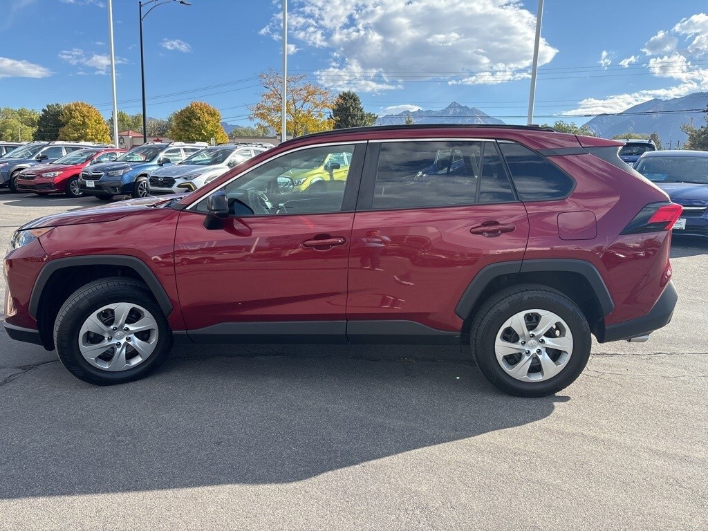 This 2021 Red Toyota RAV4 LE AWD is well equipped and includes these features and benefits: AWD, Ash w/Fabric Seat Trim, 17" Steel Wheels, 4-Wheel Disc Brakes, 6 Speakers, ABS brakes, Air Conditioning, AM/FM radio: SiriusXM, AM/FM Stereo, Apple CarPlay/Android Auto, Auto High-beam Headlights, Axle Ratio: 3.177, Brake assist, Bumpers: body-color, Driver door bin, Driver vanity mirror, Dual front impact airbags, Dual front side impact airbags, Electronic Stability Control, Emergency communication system, Exterior Parking Camera Rear, Fabric Seat Trim, Four wheel independent suspension, Front anti-roll bar, Front Bucket Seats, Front Center Armrest, Front reading lights, Illuminated entry, Knee airbag, Low tire pressure warning, Occupant sensing airbag, Outside temperature display, Overhead airbag, Overhead console, Panic alarm, Passenger door bin, Passenger vanity mirror, Power door mirrors, Power steering, Power windows, Radio data system, Rear anti-roll bar, Rear seat center armrest, Rear window defroster, Rear window wiper, Remote keyless entry, Roof rack: rails only, Speed control, Speed-sensing steering, Split folding rear seat, Spoiler, Steering wheel mounted audio controls, Tachometer, Telescoping steering wheel, Tilt steering wheel, Traction control, and Trip computer.