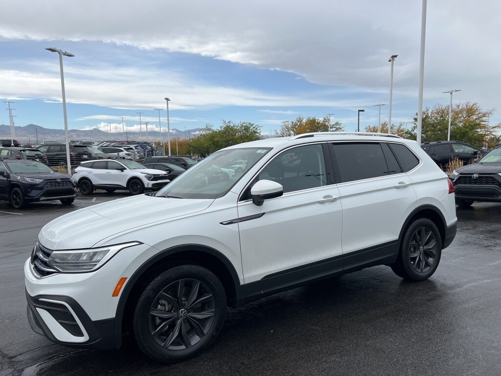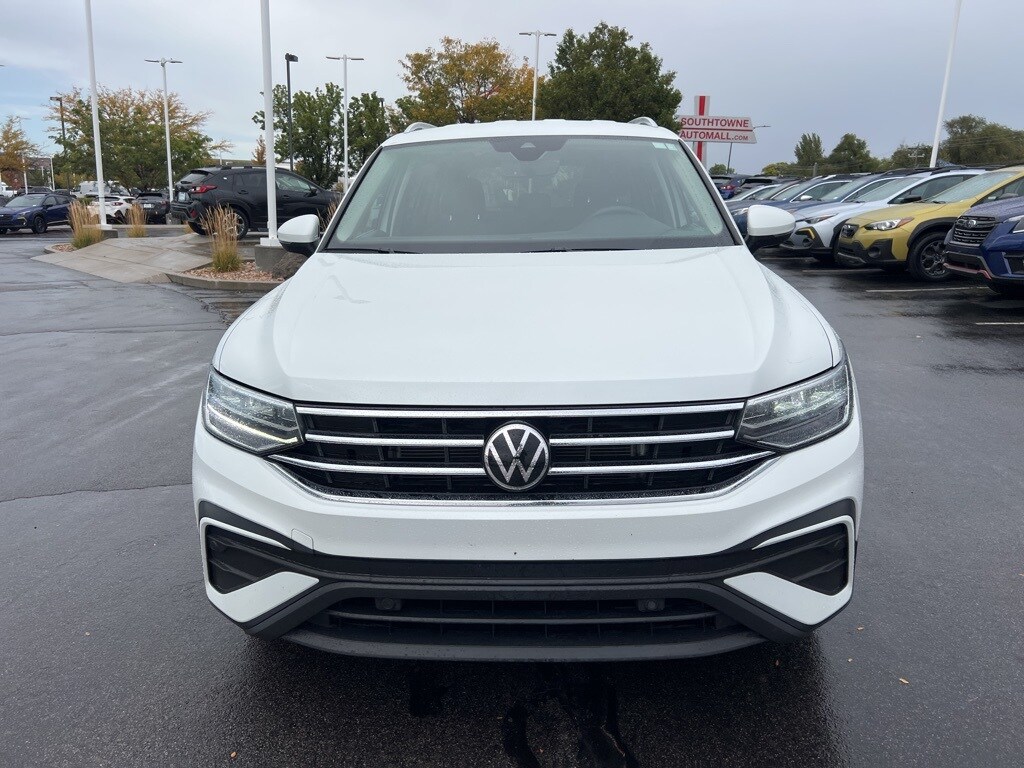 This 2023 White Volkswagen Tiguan 2.0T SE AWD is well equipped and includes these features and benefits: AWD, 3.33 Axle Ratio, 4-Wheel Disc Brakes, 4-Wheel Independent Suspension, 6 Speakers, ABS brakes, Air Conditioning, Alloy wheels, AM/FM radio: SiriusXM with 360L, Auto-dimming Rear-View mirror, Automatic temperature control, Brake assist, Bumpers: body-color, Compass, Delay-off headlights, Driver door bin, Driver vanity mirror, Dual front impact airbags, Dual front side impact airbags, Electronic Stability Control, Emergency communication system: VW Car-Net Safe & Secure 5-year, Exterior Parking Camera Rear, Four wheel independent suspension, Front anti-roll bar, Front Bucket Seats, Front Center Armrest, Front dual zone A/C, Front reading lights, Fully automatic headlights, Heated door mirrors, Heated Front Comfort Seats, Heated front seats, Illuminated entry, Leather Shift Knob, Low tire pressure warning, Occupant sensing airbag, Outside temperature display, Overhead airbag, Overhead console, Panic alarm, Passenger door bin, Passenger vanity mirror, Perforated V-Tex Leatherette Seating Surfaces, Power door mirrors, Power driver seat, Power Liftgate, Power steering, Power windows, Radio data system, Radio: MIB3 Composition Media AM/FM/HD, Rain sensing wipers, Rear anti-roll bar, Rear reading lights, Rear seat center armrest, Rear window defroster, Rear window wiper, Remote keyless entry, Security system, Speed control, Speed-sensing steering, Split folding rear seat, Spoiler, Steering wheel mounted audio controls, Tachometer, Telescoping steering wheel, Tilt steering wheel, Traction control, Trip computer, Turn signal indicator mirrors, Variably intermittent wipers, and Wheels: 18" Dark Graphite Painted 10-Spoke Alloy.